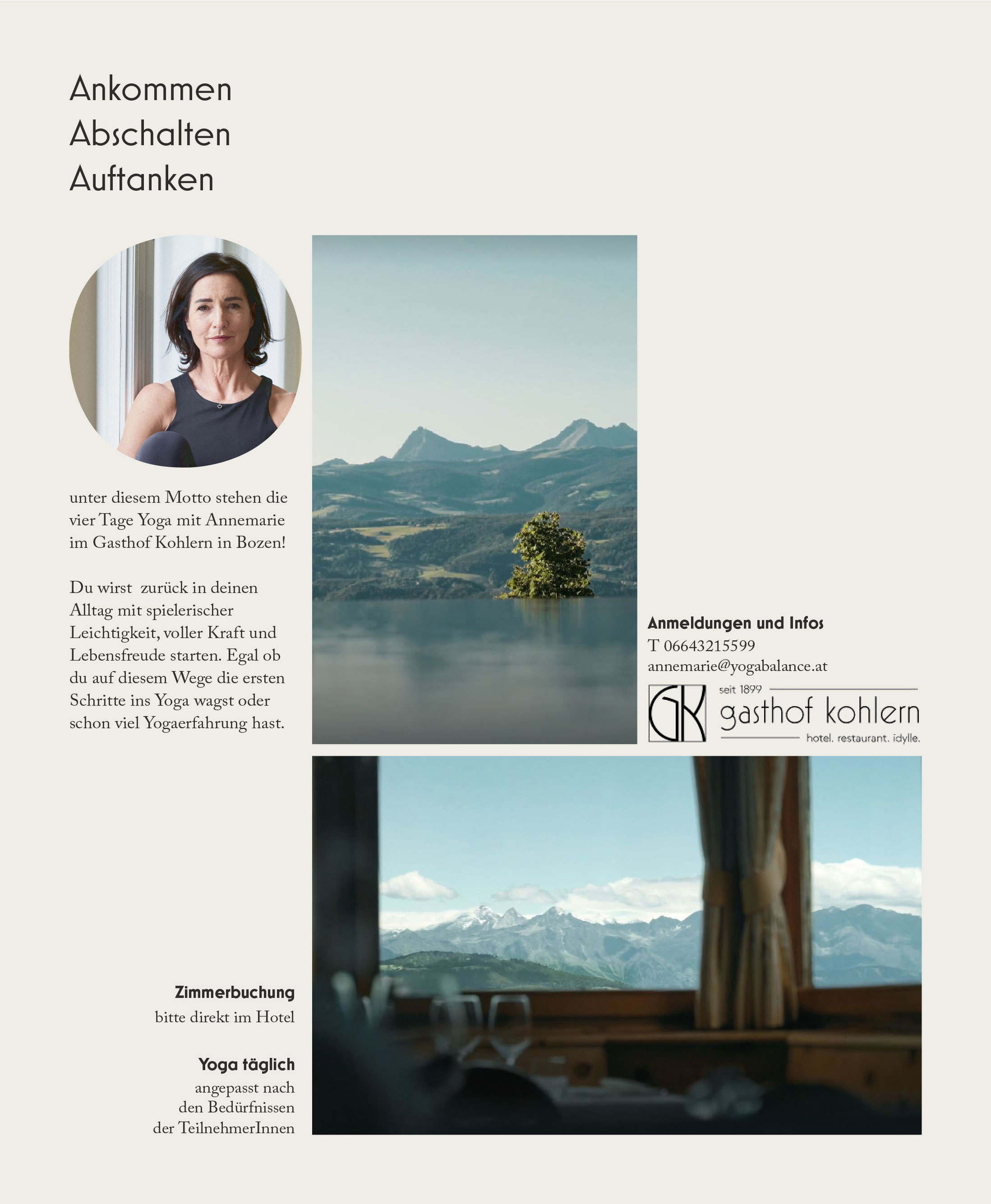 Ankommen, Abschalten, Auftanken. Unter diesem Motto stehen die vier Tage Yoga mit Annemarie! Du wirst zurück in deinen Alltag mit spielerischer Leichtigkeit, voller Kraft und Lebensfreude starten. Unsere Retreats findet im Hotel Kohlern oberhalb von Bozen statt und sind für alle Niveaus geeignet, vom Anfänger bis hin zur erfahrenen Praktikerin. An vier Tagen finden sieben Einheiten statt. Die Buchung erfolgt direkt über das Hotel.